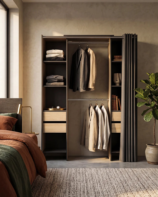 Armadio York - Guardaroba a giorno con tenda grigia - Struttura olmo - 4 ripiani e 1 cassetto inclusi - L. 110/160 x H. 205 x P. 50 cm
