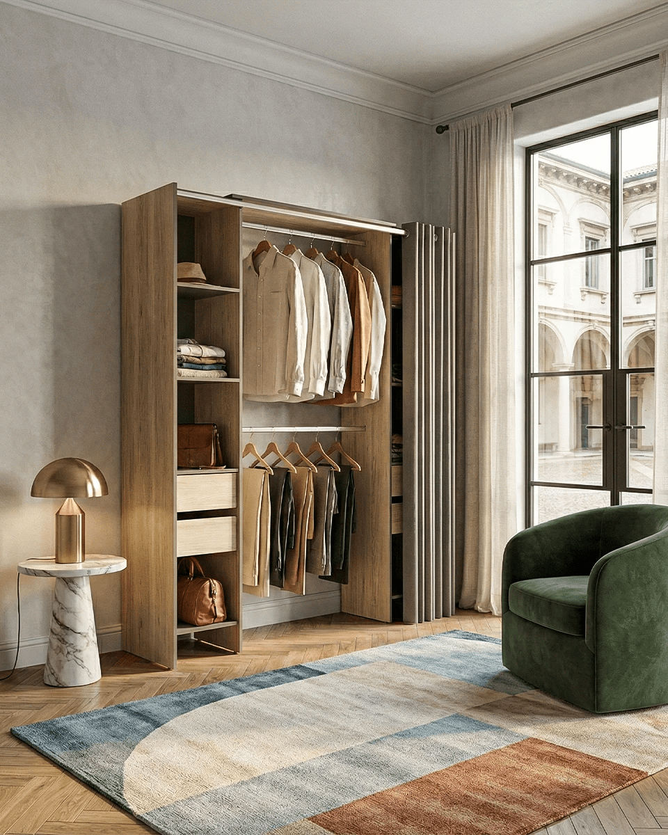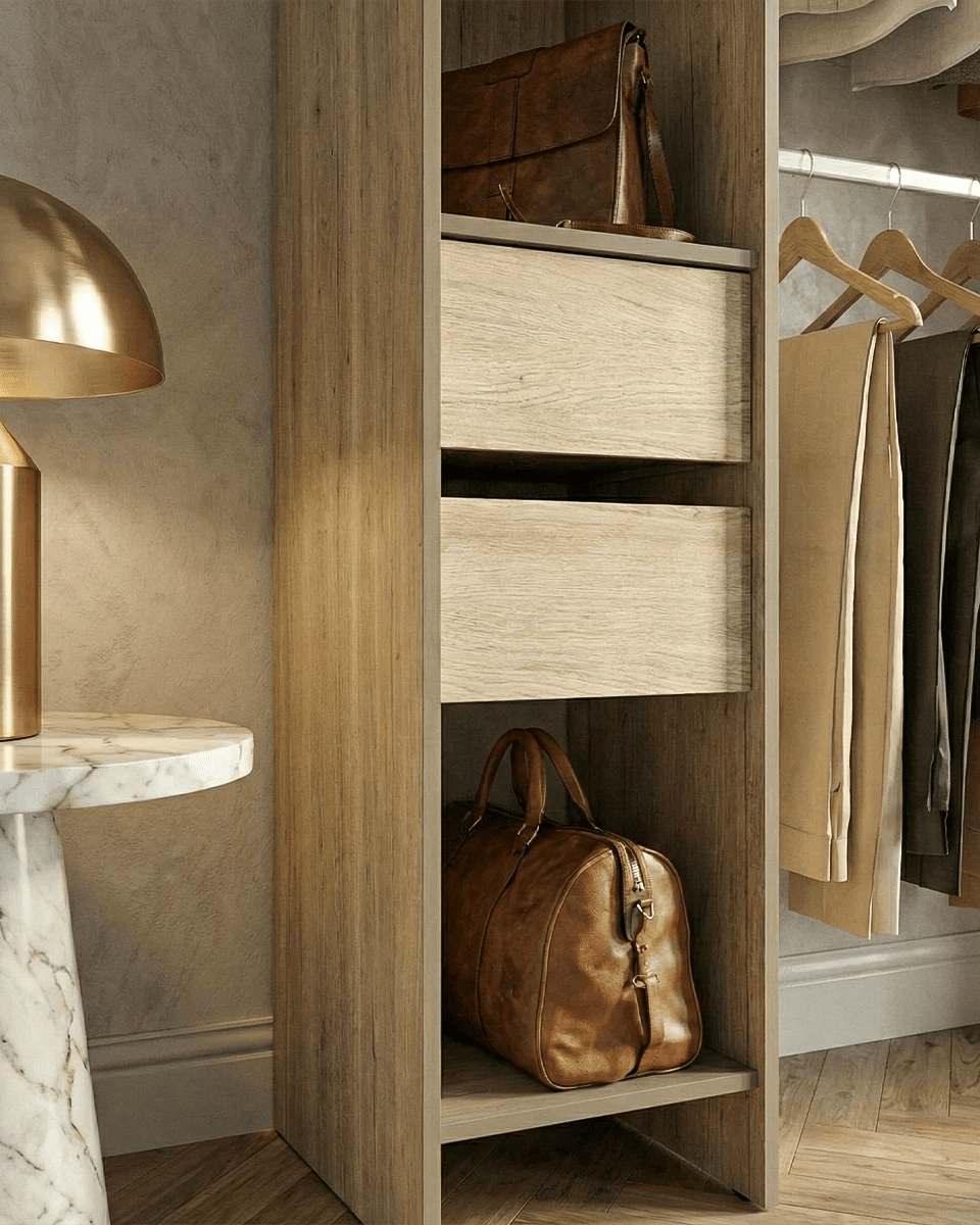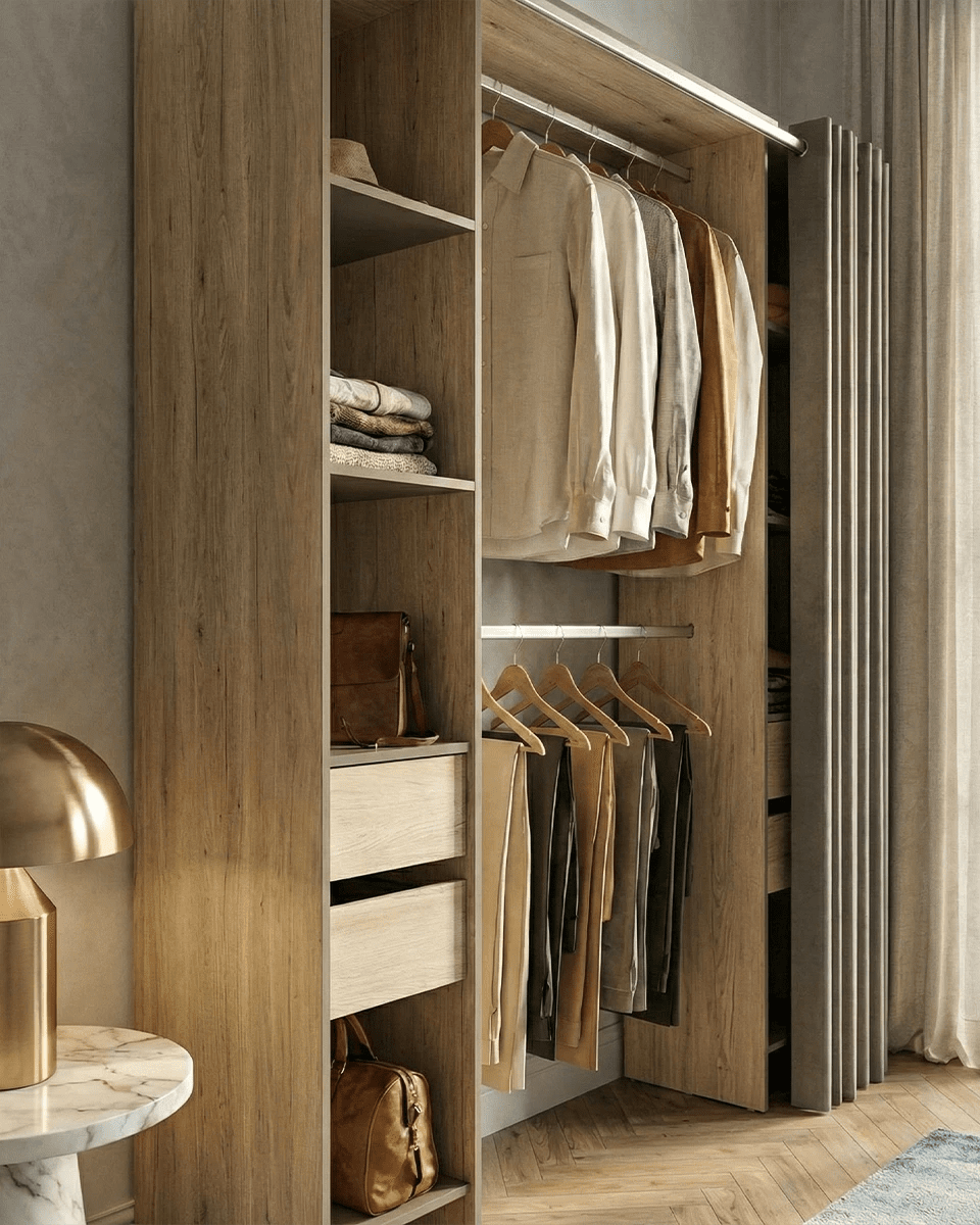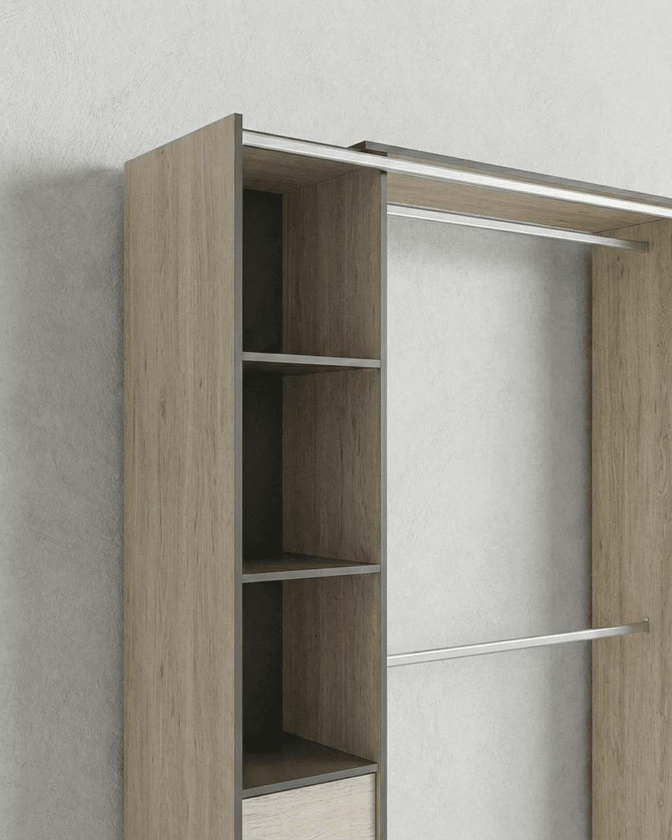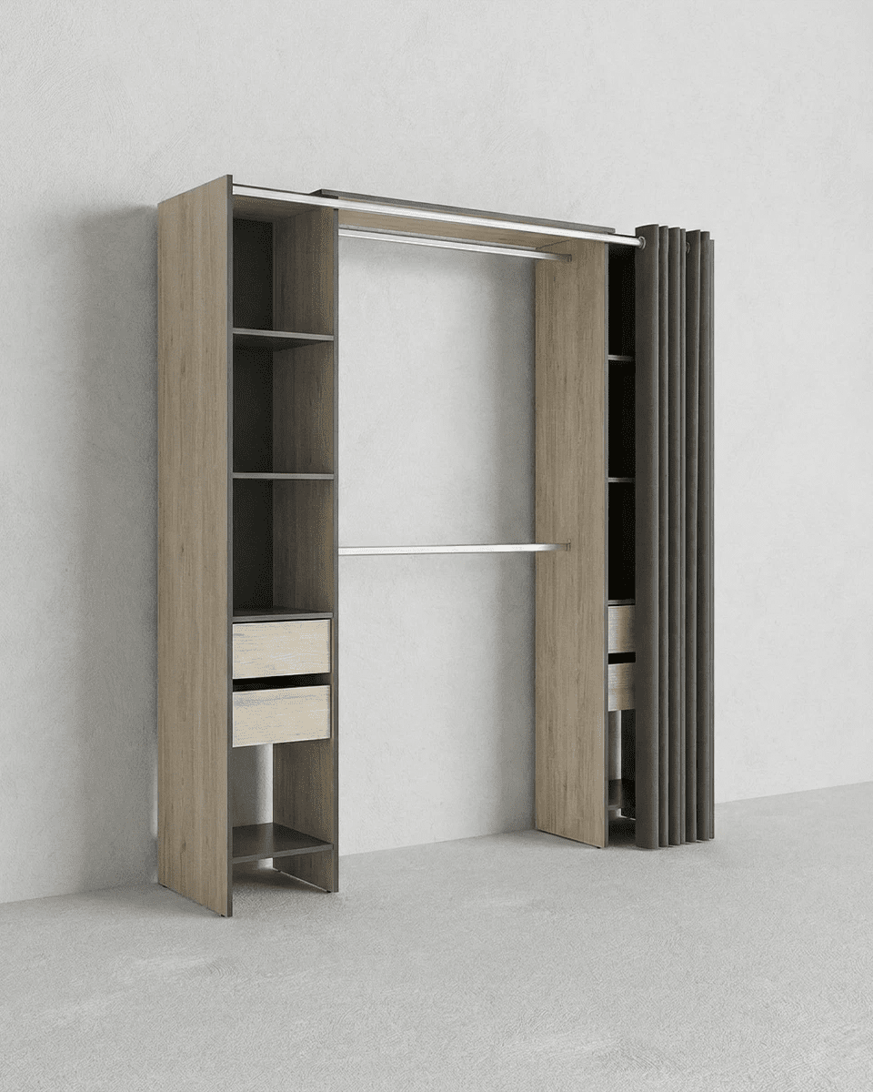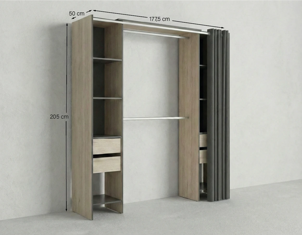 Armadio Londra - Guardaroba a giorno con tenda grigia - Struttura olmo/antracite - 8 ripiani e 4 cassetti inclusi - L. 177,5 x H. 205 x P. 50 cm