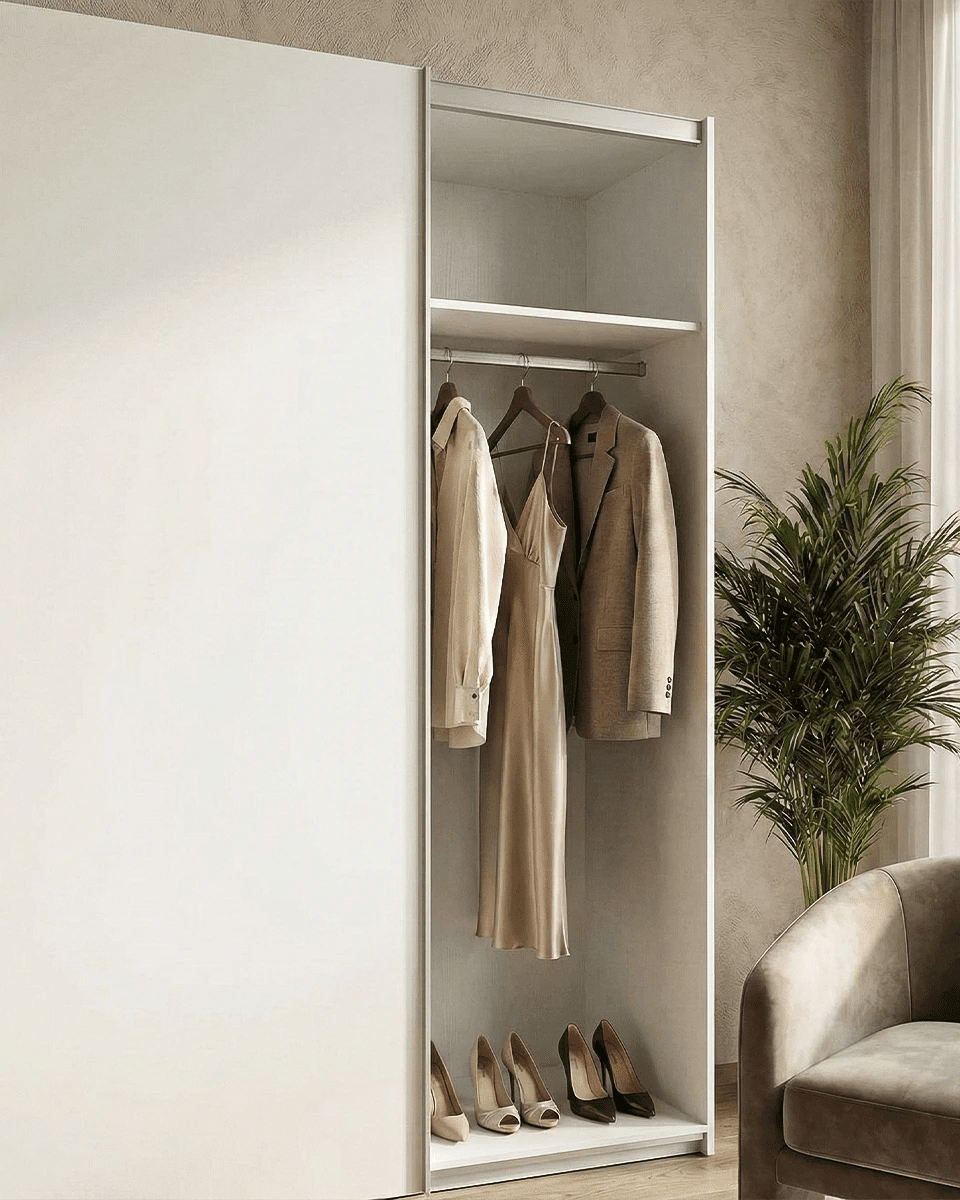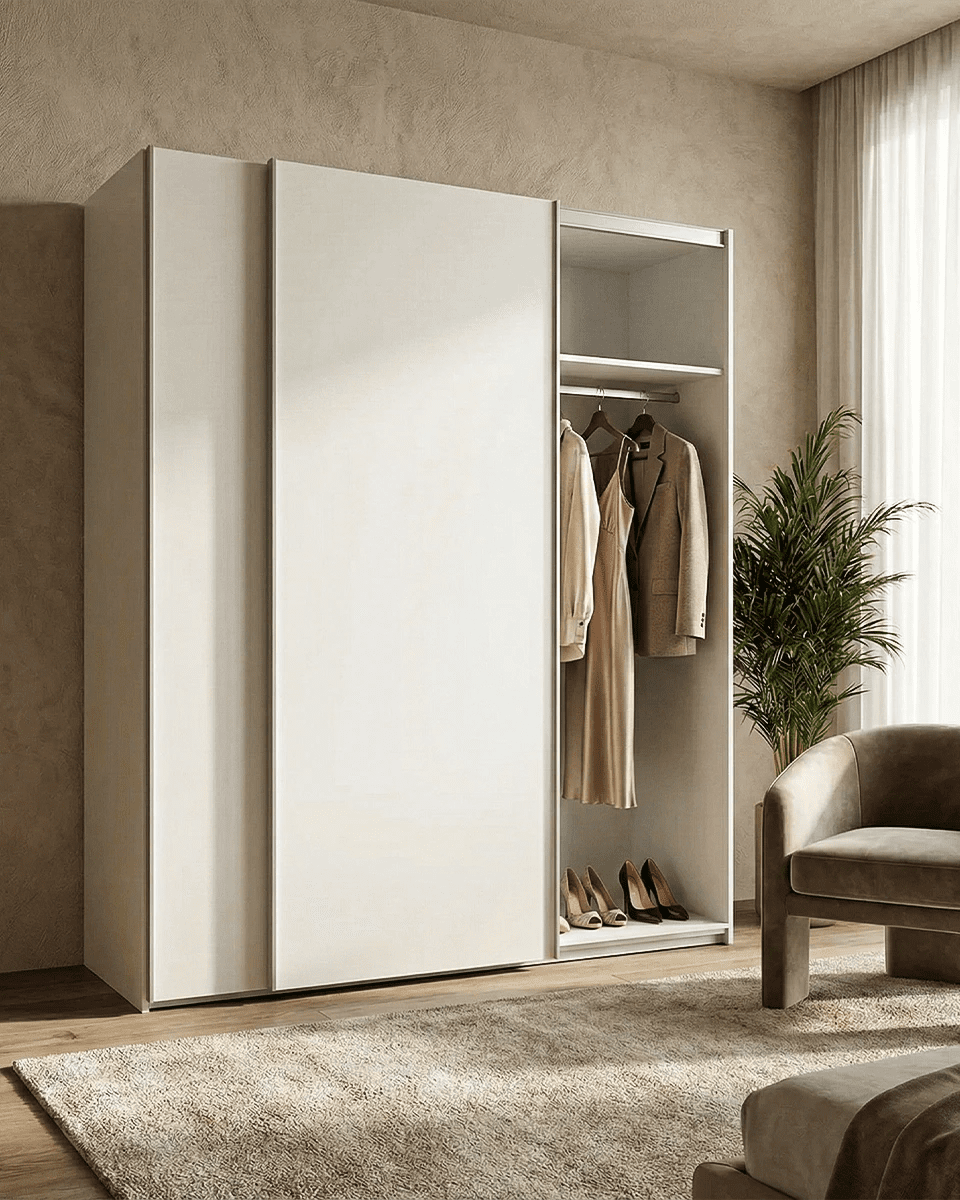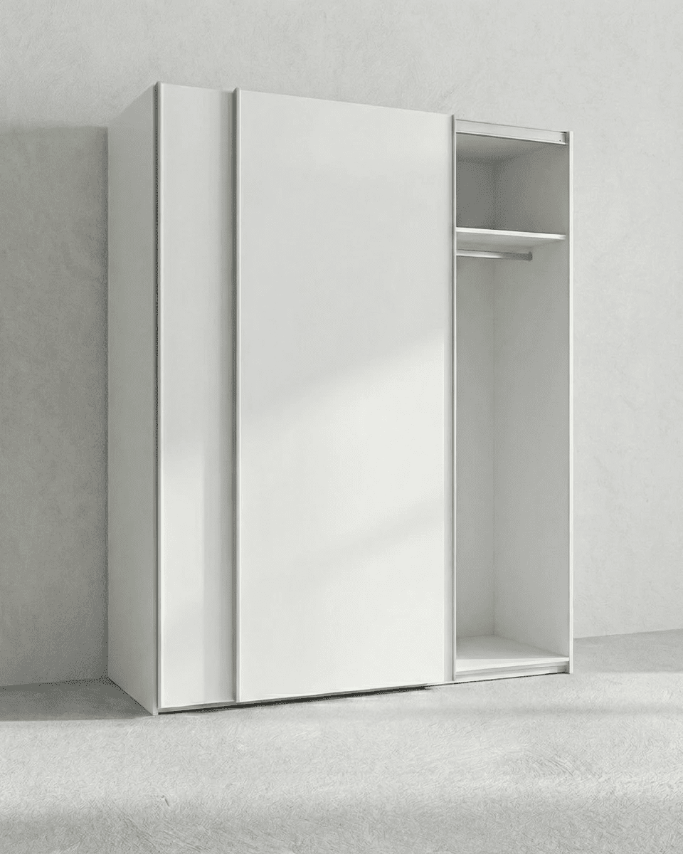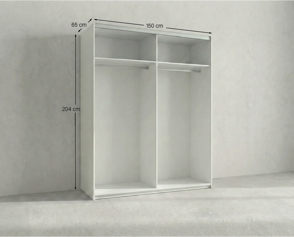 Armadio Siviglia - Guardaroba scorrevole moderno - 2 ante - Struttura bianca lucida - 2 ripiano incluso - L. 150 x H. 204 x P. 65 cm