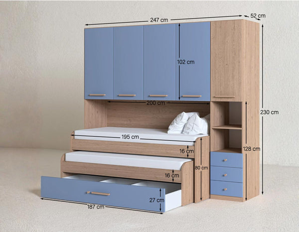 Cameretta a ponte Silvia - Armadio a ponte salvaspazio - 5 ante 2 cassetti - 7 varianti colore personalizzabili - Letto estraibile opzionale - 247 L. x 230 H. x 52 P.