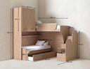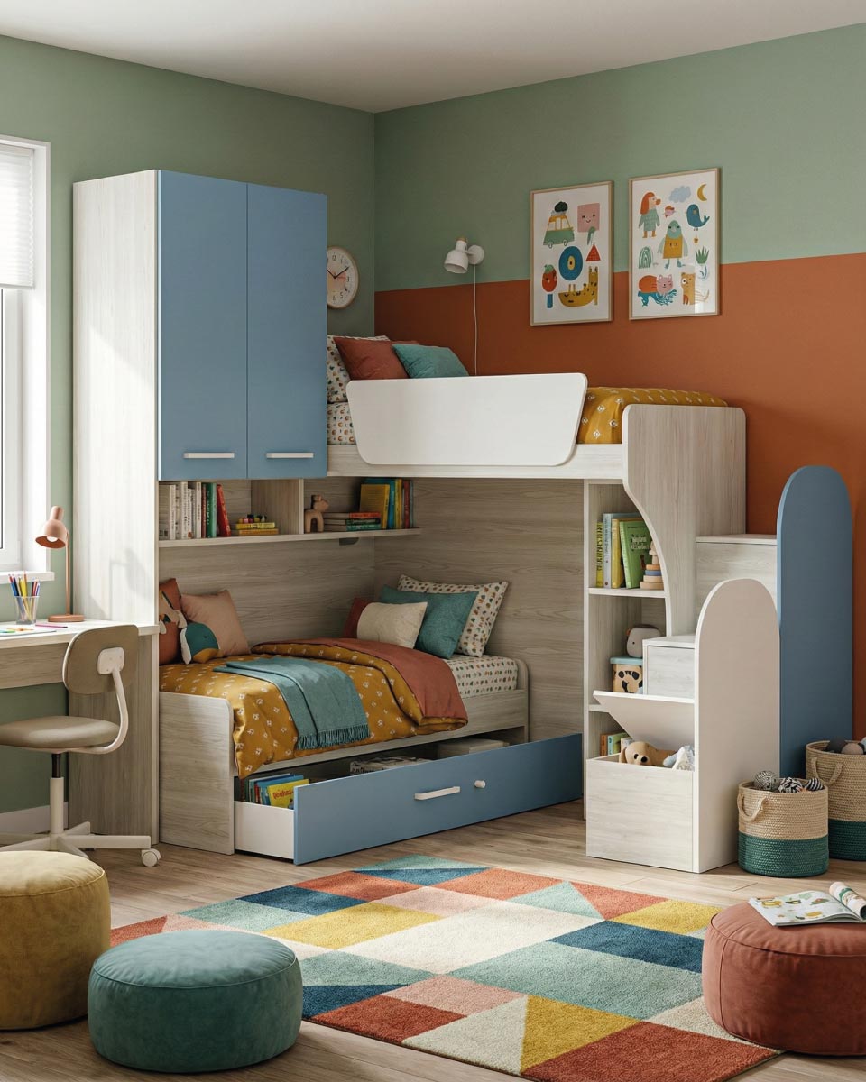 Cameretta a soppalco angolare DX Arus - Composizione salvaspazio con letto superiore - Letto attrezzato con cassettone inferiore - Scala esterna contenitore inclusa - Mensola sottoponte inclusa - 7 colori personalizzabili