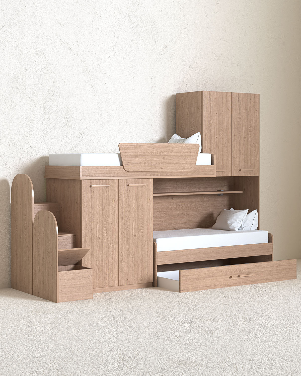 Cameretta a soppalco angolare Sx Taia - Composizione salvaspazio - Vano letto superiore - 2 armadi integrati - Letto attrezzato con cassettone estraibile incluso - Mensola sottoponte inclusa - 7 varianti colore personalizzabile