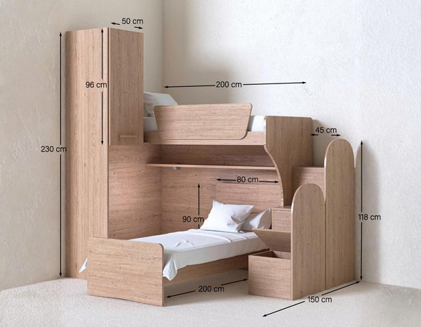 Cameretta a soppalco angolare Sx Via - Composizione salvaspazio - Vano letto superiore e letto Easy inferiore - 1 armadio integrato - Rete e materassi opzionali - Mensola sottoponte inclusa - 7 varianti colore personalizzabile