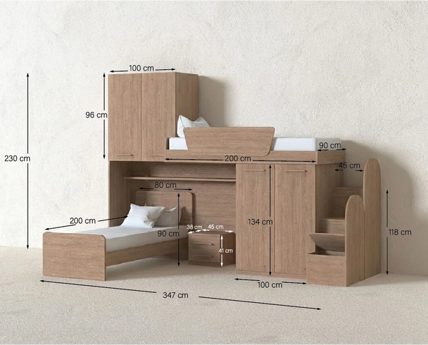 La Cameretta a soppalco angolare DX Lera è una composizione salvaspazio moderna e funzionale, progettata per sfruttare al meglio ogni centimetro della stanza. Grazie alla sua configurazione ad angolo, offre una soluzione completa e compatta, perfetta per camerette di ragazzi e bambini.