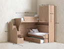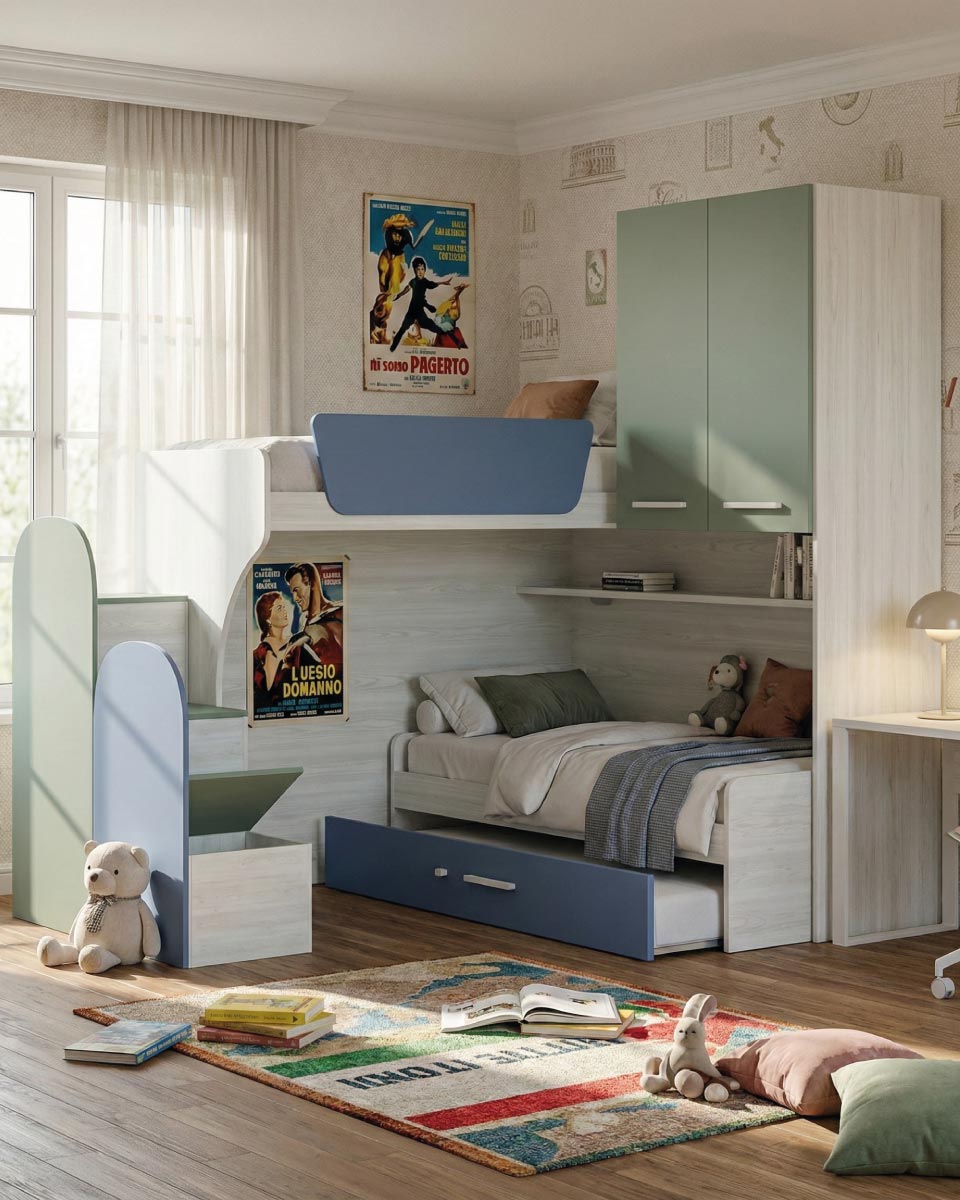 Cameretta a soppalco angolare SX Sura - Composizione salvaspazio con letto superiore - Letto estraibile inferiore - Scala esterna contenitore inclusa - Mensola sottoponte inclusa - 7 colori personalizzabili