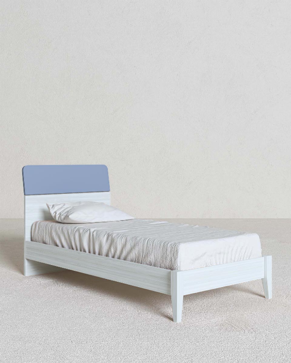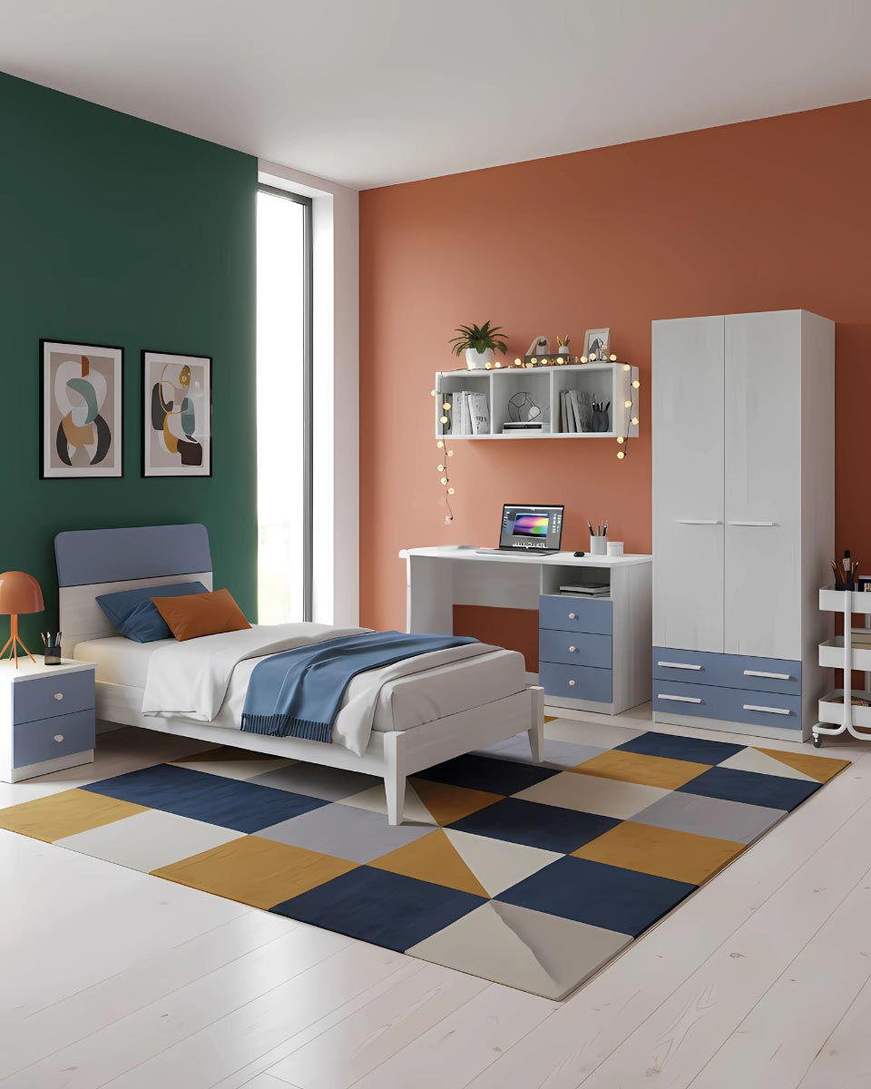 Il cuore della composizione è lo scrittoio Genius Dx, una scrivania compatta ma spaziosa, ideale per lo studio quotidiano. Accanto ad essa trova posto il letto Comby con piedi in legno, che unisce comfort e solidità in un design essenziale e contemporaneo, perfetto per accompagnare la crescita dei ragazzi. A completare la zona notte, il comodino Rima aggiunge praticità e ordine, offrendo un piano d’appoggio funzionale e discreto.