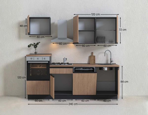 La Cucina compatta Karol 240 cm – Linea Smart è la soluzione ideale per chi desidera arredare con eleganza e funzionalità spazi contemporanei come appartamenti, B&B e hotel. Grazie alla sua larghezza di 240 cm, offre una composizione completa e bilanciata, capace di unire design moderno, robustezza e comfort d’uso in un unico blocco cucina.