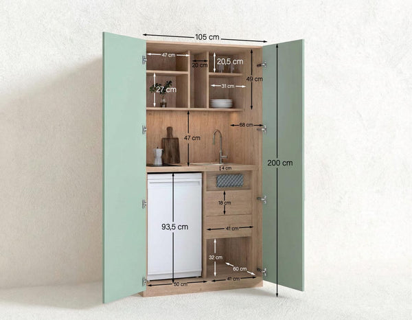 Con una larghezza di 105 cm, altezza di 200 cm e profondità di 72 cm, la Compacto Chef è un vero gioiello di design salvaspazio. Quando non viene utilizzata, le ante richiudibili consentono di nascondere completamente la zona cucina, mantenendo l’ambiente ordinato, pulito e professionale.