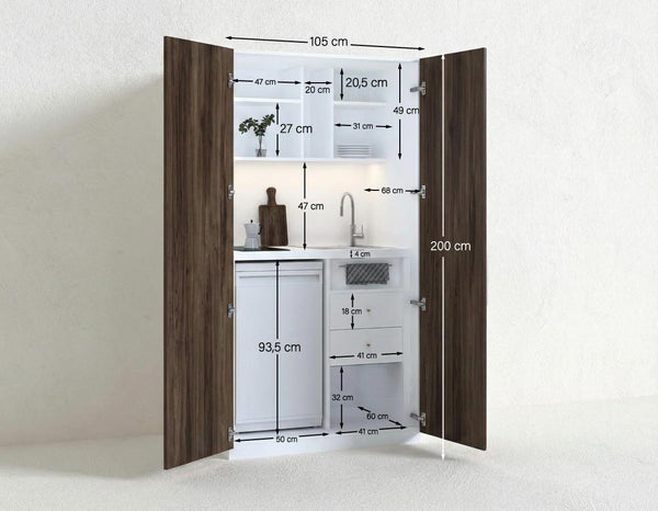 Con una larghezza di 105 cm, altezza di 200 cm e profondità di 72 cm, la Compacto Chef è un vero gioiello di design salvaspazio. Quando non viene utilizzata, le ante richiudibili consentono di nascondere completamente la zona cucina, mantenendo l’ambiente ordinato, pulito e professionale.