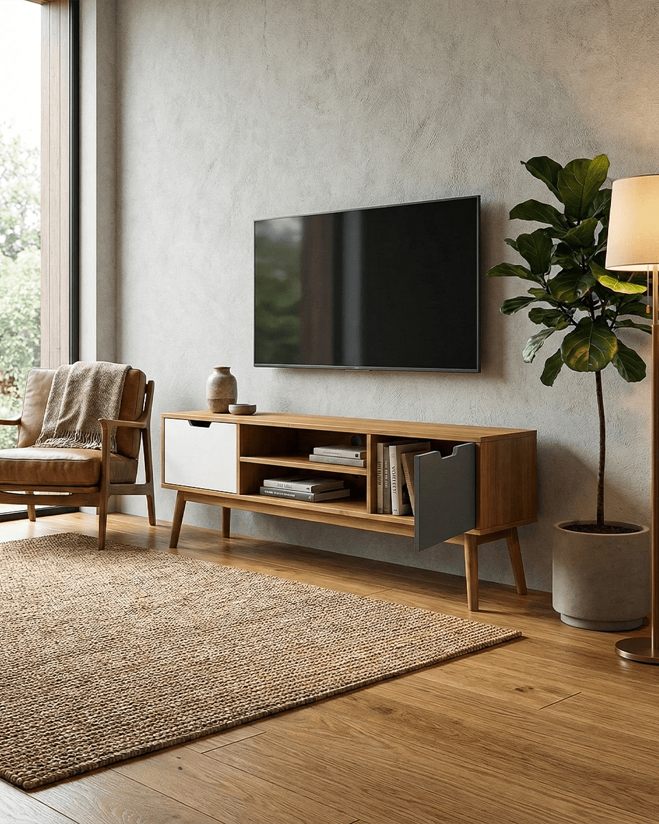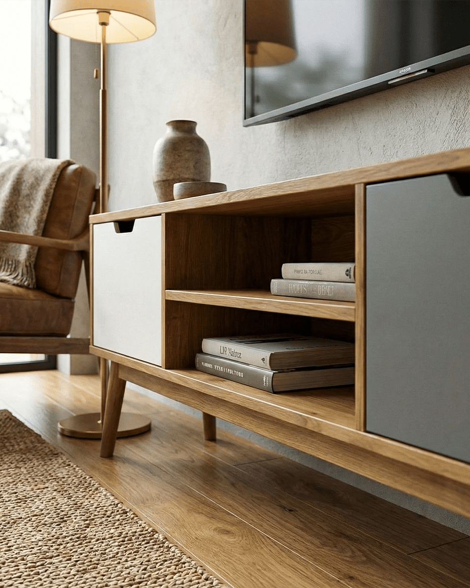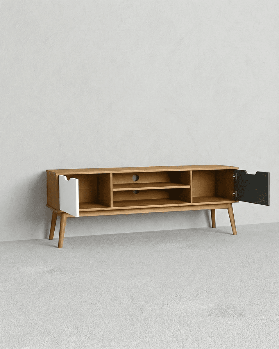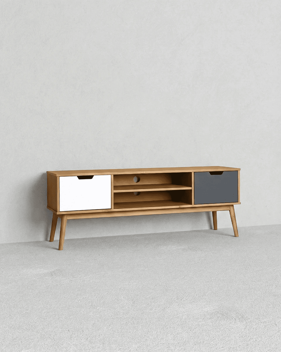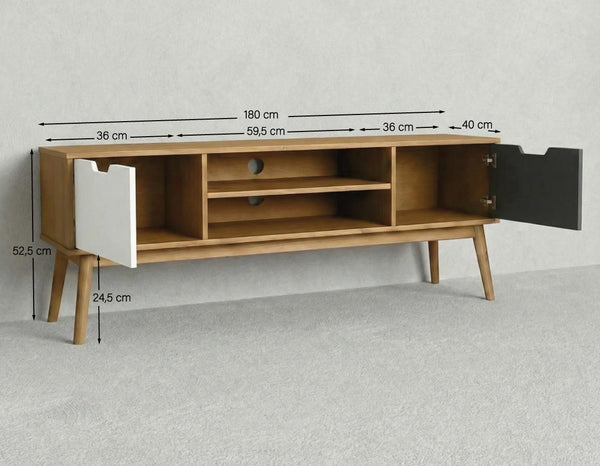 Madia Casco - Mobile TV per soggiorno, moderno - 2 ante con vano a giorno - L. 140 m x H. 52,5 cm x P.40 cm - Rovere chiaro, antracite e bianco