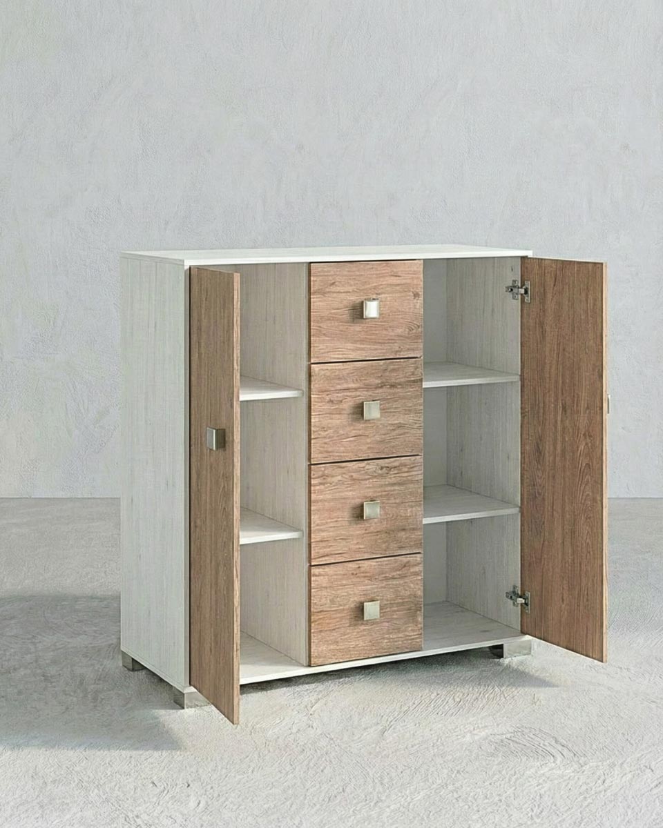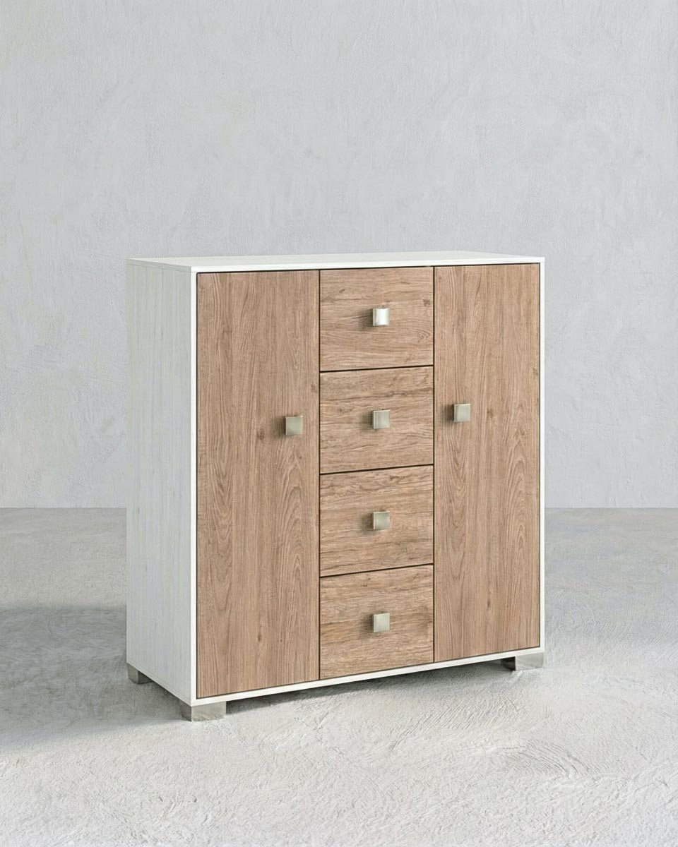 Mobile contenitore Nadia - Mobile multiuso 2 anta e 4 cassetti - Struttura bianca e ante virginia - 4 ripiani regolabile incluso - 110x112x47 cm