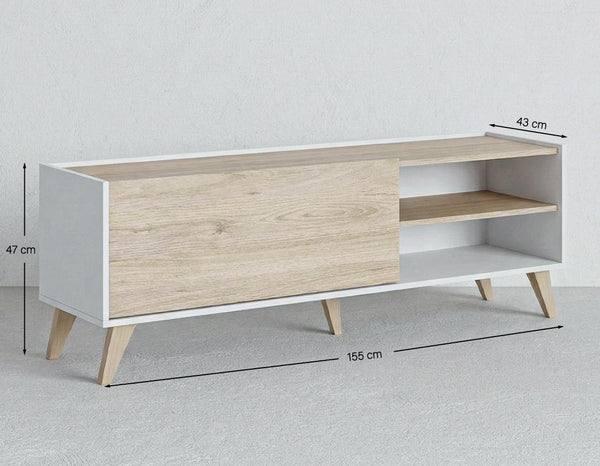 Con dimensioni di 155 cm di larghezza, 43 cm di profondità e 47 cm di altezza, il mobile Lars è ideale per ospitare televisori fino a 65 pollici, offrendo allo stesso tempo ampio spazio per organizzare dispositivi multimediali, console, decoder e accessori. La struttura è studiata per garantire ordine e praticità, grazie alla presenza di un’anta con apertura assistita e vani a giorno con ripiano, perfetti per riporre o esporre dispositivi e oggetti decorativi.