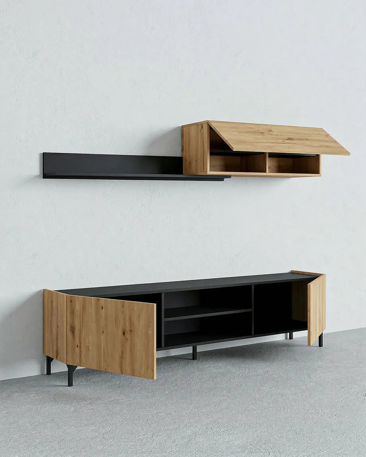 Il pensile sospeso superiore, dal design minimal, completa la composizione offrendo ulteriore spazio contenitivo e una superficie perfetta per esporre libri, piccoli complementi d’arredo o elementi decorativi. La combinazione cromatica nero opaco e rovere naturale crea un contrasto elegante che si integra perfettamente in ambienti moderni, industrial o contemporanei.
