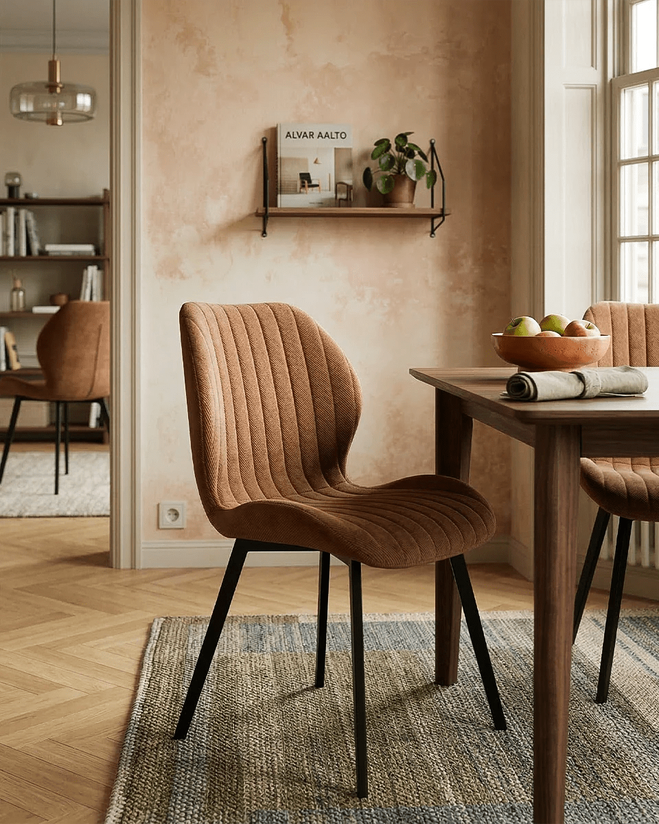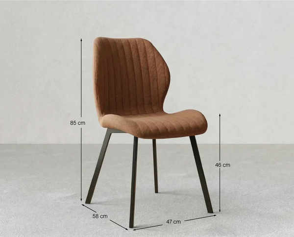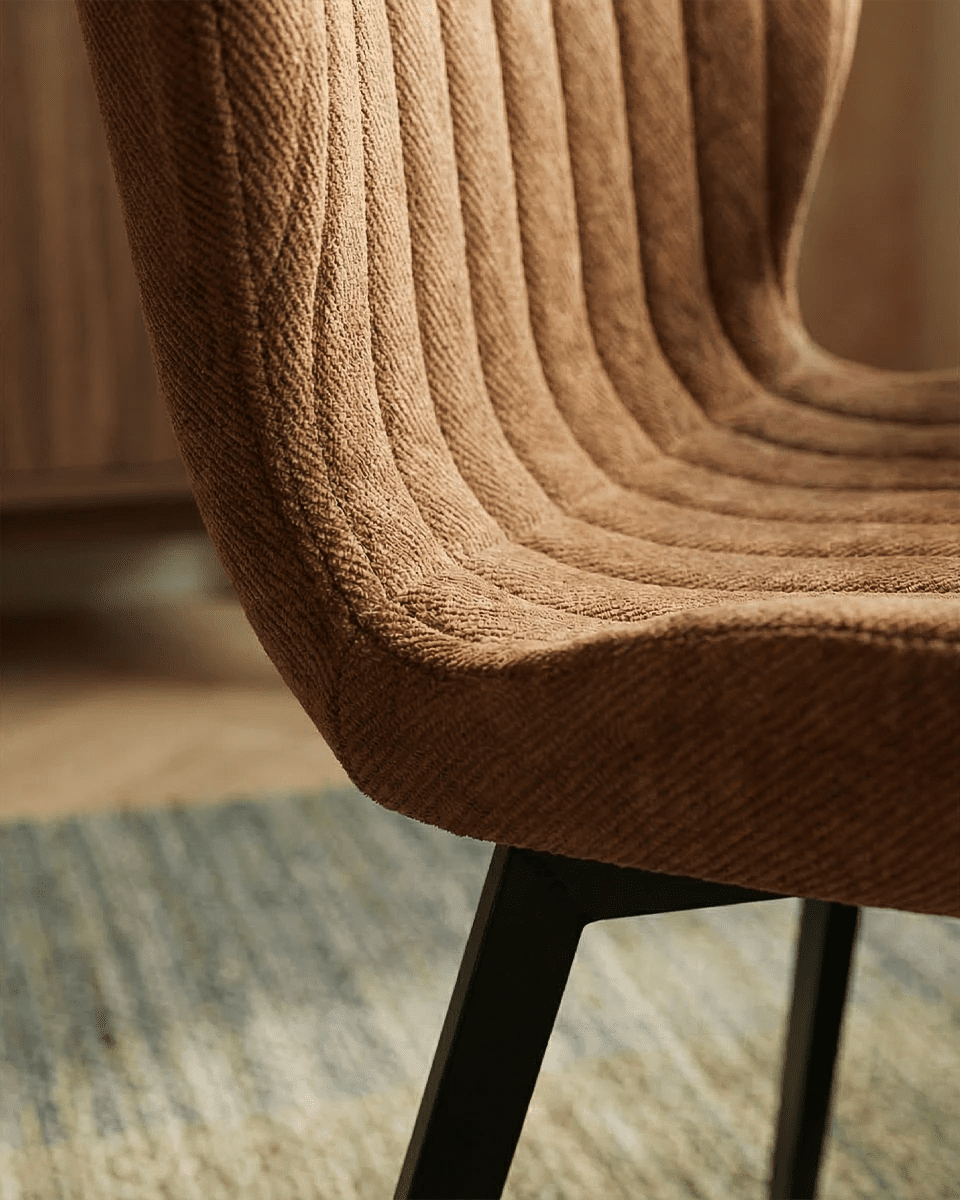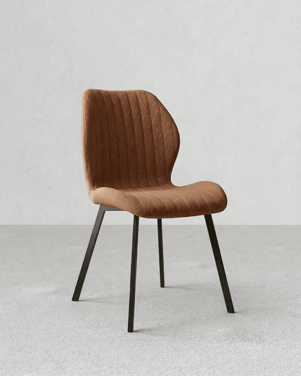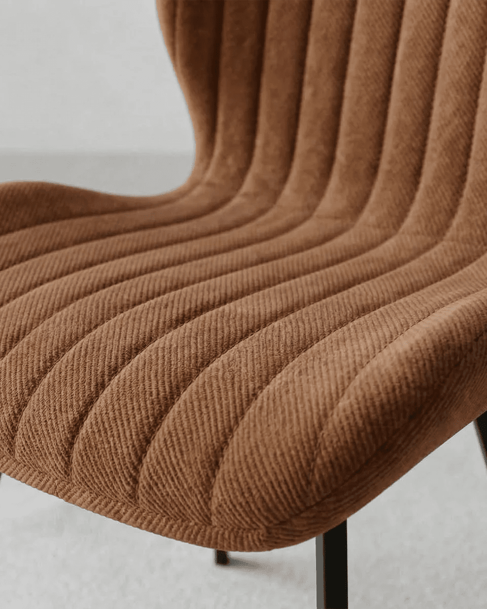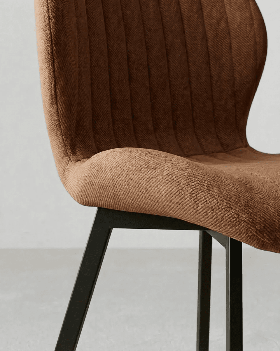 Il rivestimento in tessuto effetto velluto color bronzo dona profondità e calore agli spazi, rendendo la sedia perfetta per ambienti moderni, industrial o dal gusto retrò. Il tessuto è idrorepellente, morbido al tatto e resistente all’usura, caratteristiche che garantiscono praticità nell’utilizzo quotidiano senza rinunciare all’eleganza. La lavorazione trapuntata dello schienale non è solo un dettaglio estetico, ma contribuisce anche a rendere la seduta più accogliente e confortevole.