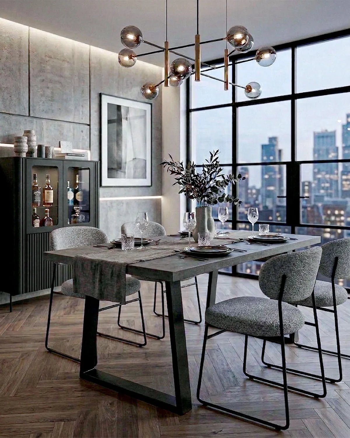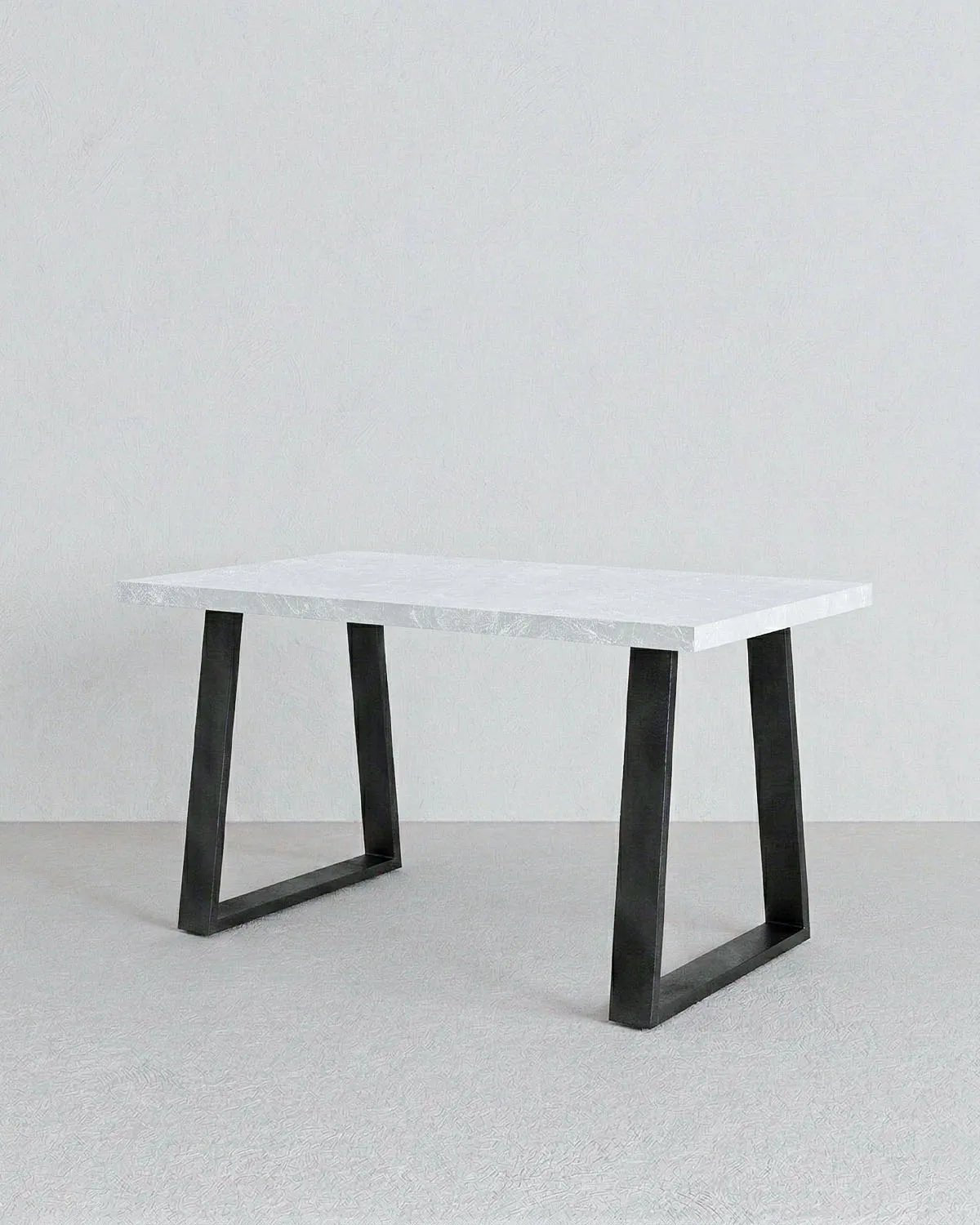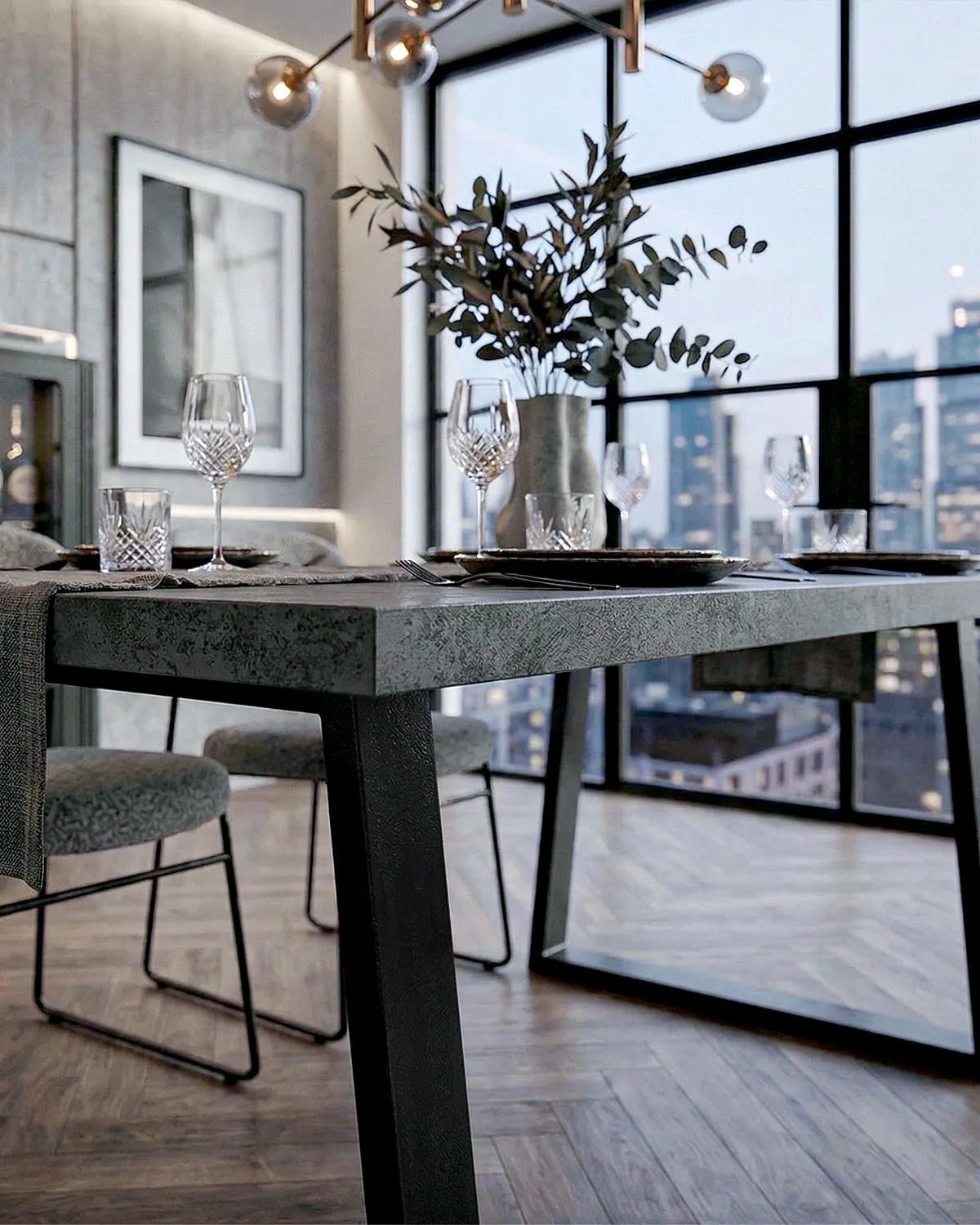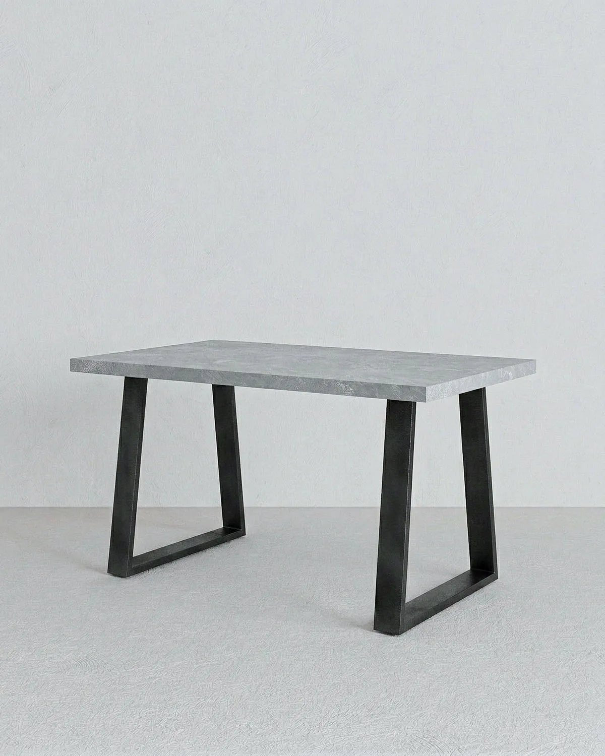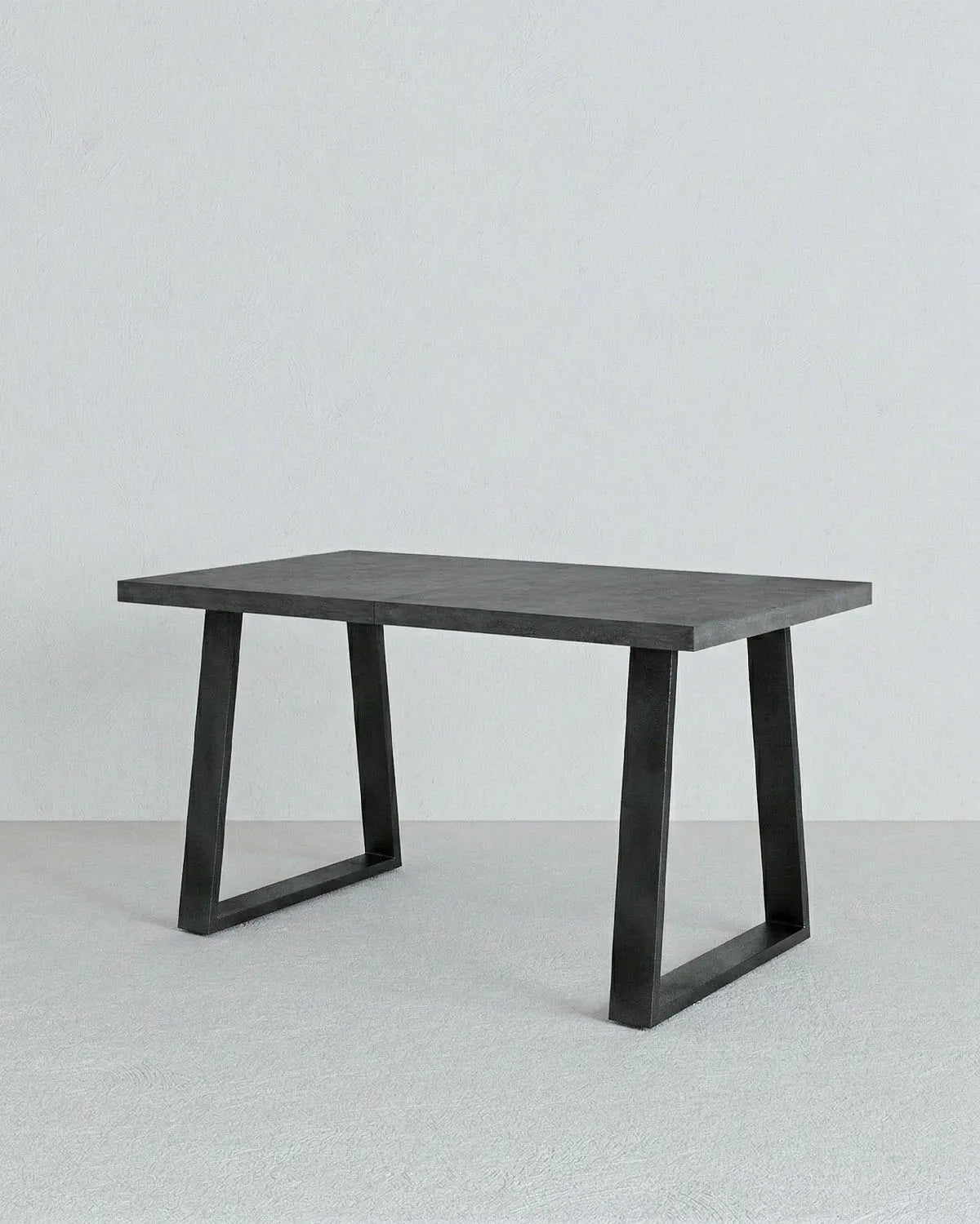 Il piano con finitura spatolata dona al tavolo un aspetto elegante e contemporaneo, mentre le gambe in metallo nero opaco assicurano stabilità e resistenza nel tempo. Il design delle gambe, solido e geometrico, crea un piacevole contrasto con il piano e conferisce al tavolo un carattere deciso e moderno.
