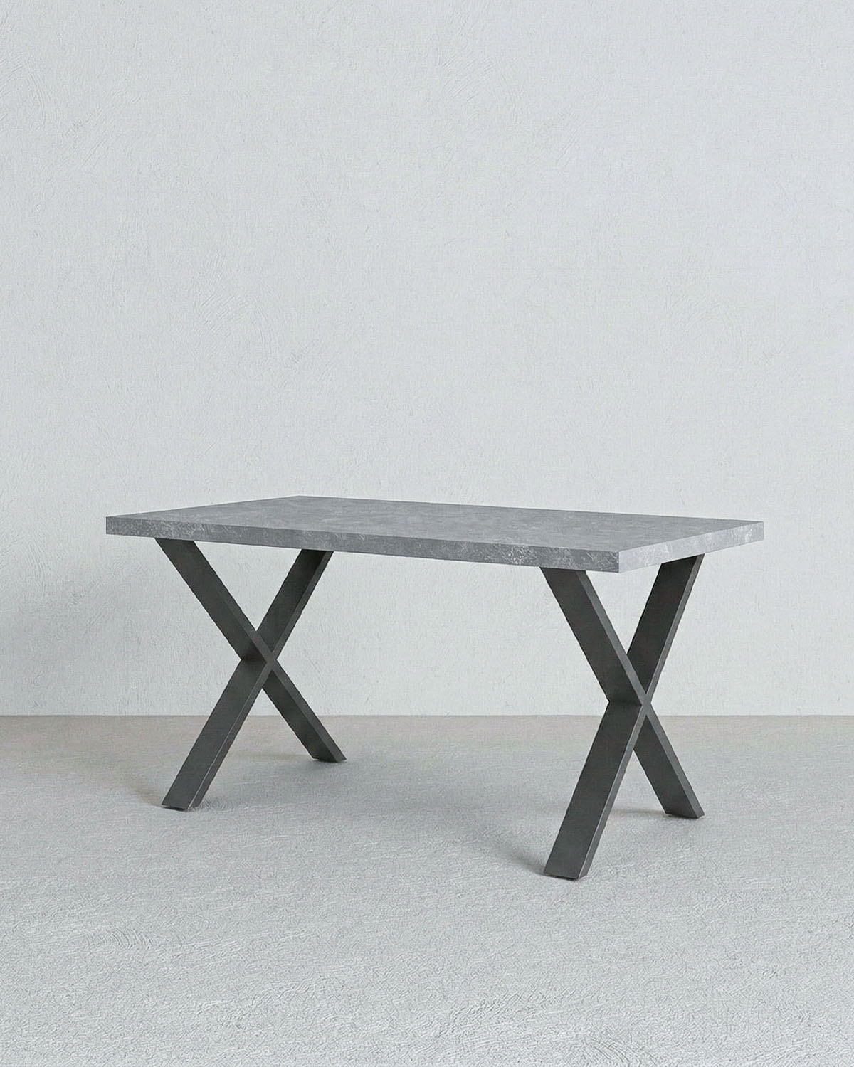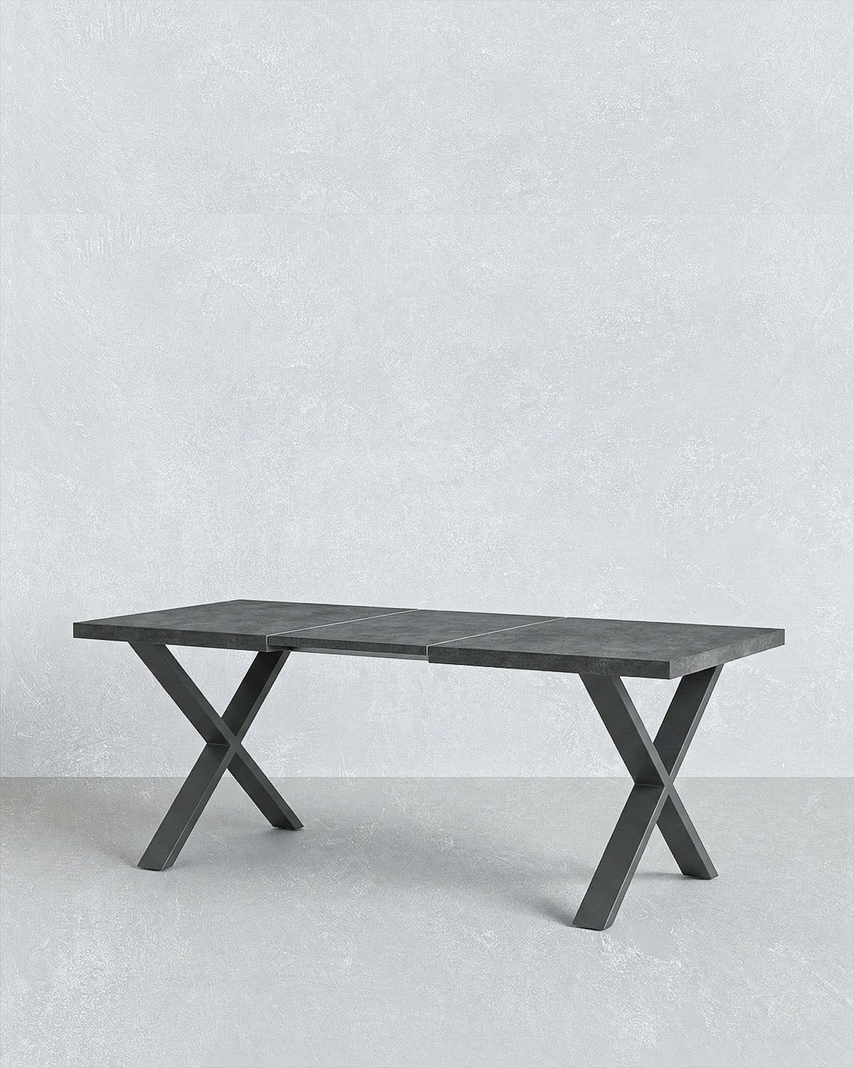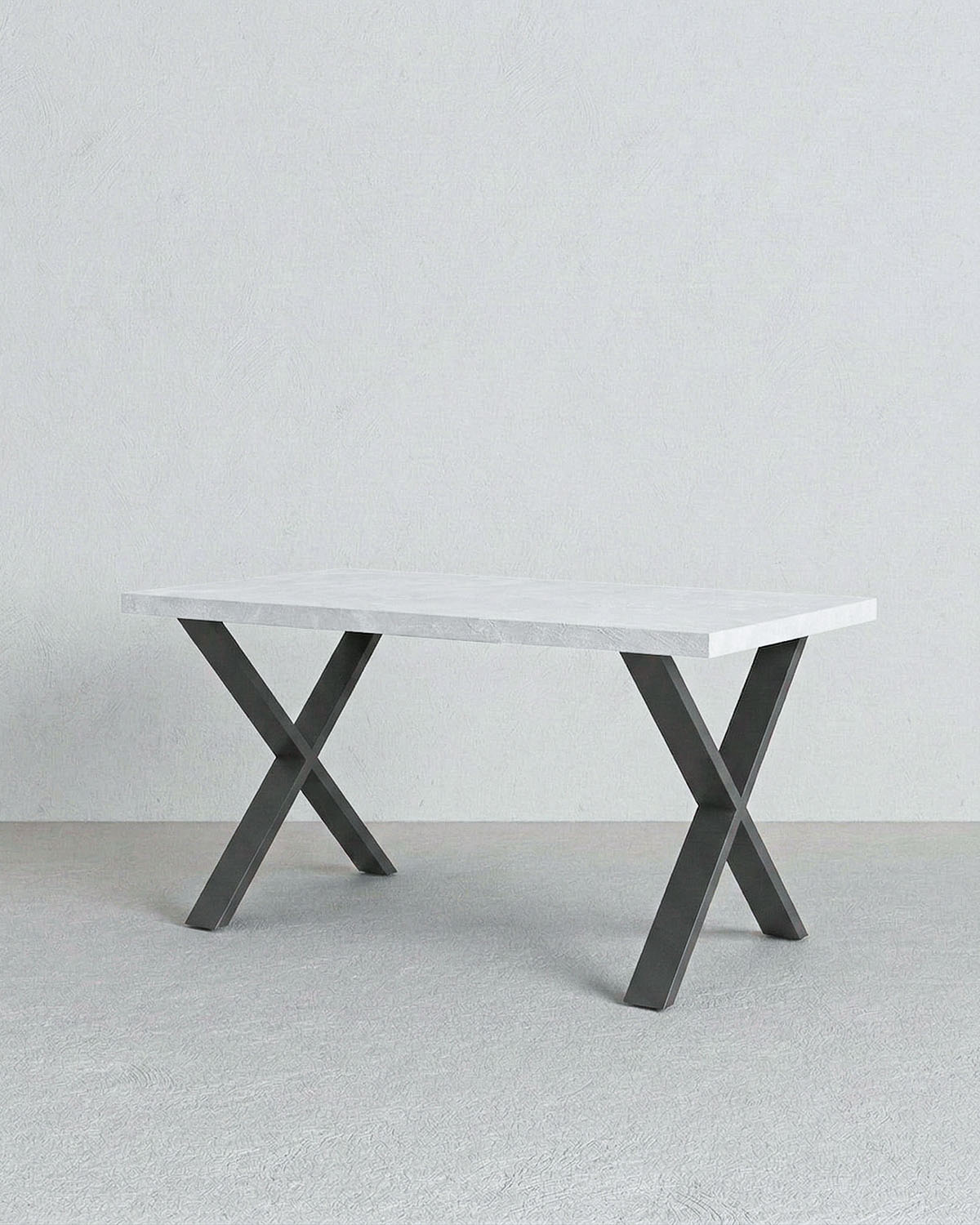 Il piano effetto spatolato dona al tavolo un’estetica raffinata e contemporanea, mentre la struttura robusta garantisce stabilità e resistenza nel tempo. Le gambe incrociate in metallo nero opaco non solo assicurano solidità, ma creano anche un contrasto moderno con il piano, valorizzando l’ambiente con un design deciso e ricercato.