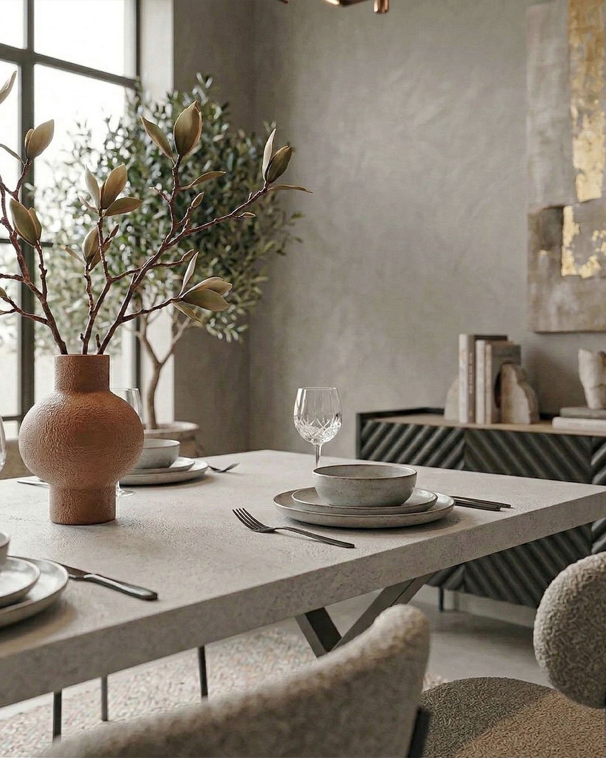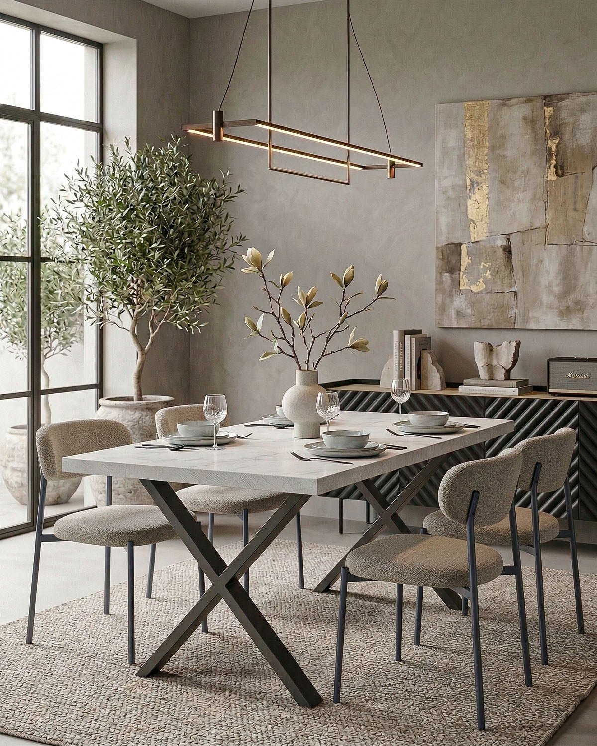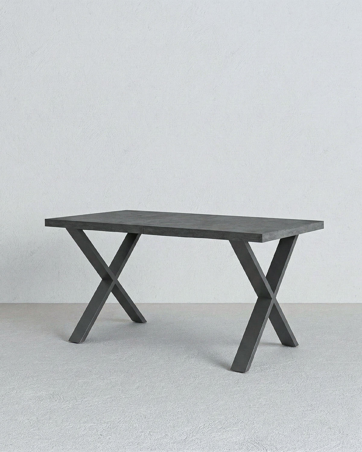 Il piano effetto spatolato dona al tavolo un’estetica raffinata e contemporanea, mentre la struttura robusta garantisce stabilità e resistenza nel tempo. Le gambe incrociate in metallo nero opaco non solo assicurano solidità, ma creano anche un contrasto moderno con il piano, valorizzando l’ambiente con un design deciso e ricercato.